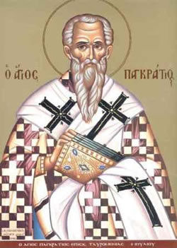 Εἰληφὼς Παγκράτιε, ὡς Ἀποστόλων ὁμόπνους, τοῦ Ἁγίου Πνεύματος, τὰς μυστικὰς ἐνεργείας, ἔλαμψας, θεογνωσίαν τοὶς ἐν τῇ Δύσει· ἤλασας, τῆς ἀθεΐας τὴν σκοτομήνην, καὶ νομίμως ἐναθλήσας, πρὸς φέγγος ἤρθης, τῆς ἀνεσπέρου ζωῆς.