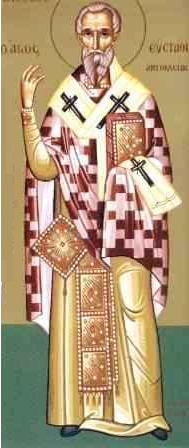 Τόν Υἱόν ὁμότιμον τῷ Πατρί, Πάτερ δογματίζων, καί τῷ Πνεύματι συμφυῆ, τῆς ὁμολογίας, τόν στέφανον ἐδέξω, Εὐστάθιε ποικίλαις, παλαίσας θλίψεσι.