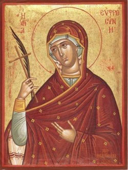 Ὡς παρθένος φρονίμη καί ἀδιάφθορος, κατηγγυήθης ὁσίως τῷ Ζωοδότῃ Χριστῷ, καί προσκαίρων τήν χλιδήν ἐμφρόνως ἔλιπες· ὅθεν ἐν μέσῳ τῶν ἀνδρῶν, ὡς ἀμόλυντος ἀμνάς, ἐξέλαμψας Εὐφροσύνη, καί τοῦ Βελίαρ τά κέντρα, τῇ πολιτείᾳ σου ἀπήμβλυνας.