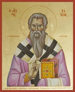 Ἀπόστολος Τίτος, ὁ ὁποῖος ἦταν Ἕλληνας στήν καταγωγή, ἦταν πολύ μορφωμένος. Ἔγινε χριστιανός ἀπό τόν Ἀπόστολο Παῦλο, μέ τόν ὁποῖο καί συνεργάστηκε, στήν διάδοση τοῦ Εὐαγγελίου. Τόν ἀκολούθησε στήν Ἱερουσαλήμ καί κατόπιν ἐπιφορτίστηκε νά πάει στήν Κόρινθο γιά νά δεῖ τήν κατάσταση τῆς ἐκεῖ Ἐκκλησίας.