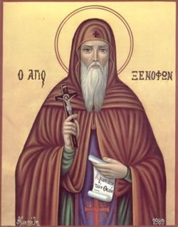Ὅσιος Ξενοφῶν κατοικοῦσε στήν Κωνσταντινούπολη κατά τούς χρόνους τῶν αὐτοκρατόρων Ἰουστίνου Α’ (518 – 527 μ.Χ.) καί Ἰουστινιανοῦ (527 – 565 μ.Χ.). Ἦταν πλούσιος συγκλητικός καί διακρινόταν γιά τήν βαθιά εὐσέβειά του πρός τόν Θεό. Εἶχε δύο παιδιά, τόν Ἀρκάδιο καί τόν Ἰωάννη. Μόλις αὐτά τελείωσαν τά ἐγκύκλια γράμματα, τά ἔστειλε στή Βηρυττό τῆς Φοινίκης, γιά νά μελετήσουν καί νά σπουδάσουν τή νομική ἐπιστήμη. Καθ’ ὁδόν τό πλοῖο μέ τό ὁποῖο ταξίδευαν ναυάγησε. Διασώθηκαν ὅμως καί μετέβησαν στά Ἱεροσόλυμα ὅπου ἔγιναν μοναχοί. Οἱ γονεῖς τους, Ξενοφῶν καί Μαρία, τούς ἀναζήτησαν καί πληροφορήθηκαν ὅτι διάγουν στήν ἔρημο ἀσκητικό βίο, δόξασαν τόν Θεό καί ἀποταξάμενοι τόν κόσμο, ἀκολούθησαν καί αὐτοί τό μοναχικό βίο.
