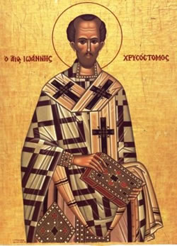 Ἡ τοῦ στόματός σου καθάπερ πυρσός, ἐκλάμψασα χάρις τήν οἰκουμένην ἐφώτισεν, ἀφιλαργυρίας τῷ κόσμῳ θησαυρούς ἐναπέθετο, τό ὕψος ἡμῖν τῆς ταπεινοφροσύνης ὑπέδειξεν. Ἀλλά σοῖς λόγοις παιδεύων, Πάτερ, Ἰωάννη Χρυσόστομε, πρέσβευε τῷ Λόγῳ Χριστῷ τῷ Θεῷ, σωθῆναι τάς ψυχάς ἡμῶν.