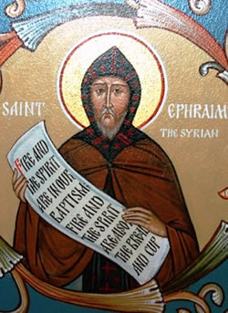 Ὅσιος Ἐφραίμ καταγόταν ἀπό τήν Ἀνατολή καί γεννήθηκε στήν πόλη Νίσιβη τῆς Μεσοποταμίας πιθανῶς τό 308 μ.Χ. ἢ καί ἐνωρίτερα. Ἤκμασε ἐπί Μεγάλου Κωνσταντίνου (324 – 337 μ.Χ.), Ἰουλιανοῦ τοῦ Παραβάτου (361 – 363 μ.Χ.) καί τῶν διαδόχων αὐτοῦ. Ἀπό τήν μικρή του ἡλικία διδάχθηκε τήν πίστη καί τήν ἀρετή ἀπό τόν Ἐπίσκοπο τῆς γενέτειράς του Ἰάκωβο (309 – 364 μ.Χ.), ὁ ὁποῖος καί τόν χειροτόνησε διάκονο, ἀλλά ὁ Ὅσιος ἀρνήθηκε νά λάβει μεγαλύτερο ἀξίωμα. Ἀκολούθησε πολύ νωρίς τόν μοναχικό βίο καί μέ τό φωτισμό τοῦ Παρακλήτου ἔγραψε πάρα πολλά συγγράμματα πνευματικῆς καί ἠθικῆς οἰκοδομῆς. Γι’ αὐτό καί θαυμάζεται γιά τό πλῆθος καί τό κάλλος τῶν ἔργων του.