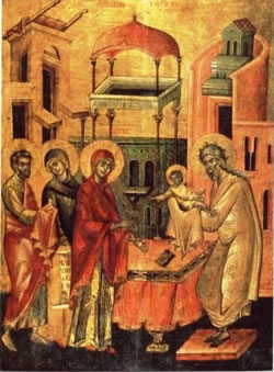 Όταν, σύμφωνα με τον μωσαϊκό Νόμο, συμπληρώθηκαν οι μέρες για τον καθαρισμό τους, έφεραν το παιδί στα Ιεροσόλυμα, για να το αφιερώσουν στον Θεό. Σύμφωνα με το νόμο του Κυρίου, αν το πρώτο παιδί που φέρνει στον κόσμο μια γυναίκα είναι αγόρι, πρέπει να θεωρείται αφιερωμένο στον Κύριο. Επίσης θα προσέφεραν θυσία ένα ζευγάρι τρυγόνια ή δύο μικρά περιστέρια, όπως λέει ο νόμος του Κυρίου.