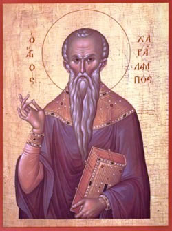 Ὡς φωστήρ ἀνέτειλας ἐκ τῆς Ἑῴας, καί πιστούς ἐφώτισας, ταῖς τῶν θαυμάτων σου βολαῖς, Ἱερομάρτυς Χαράλαμπες· ὅθεν τιμῶμεν, τήν θείαν σου ἄθλησιν.