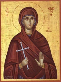 Φιλοθέως ἤνυσας τήν βιοτήν σου, Φιλοθέη πάνσεμνε, καί τῶν Μαρτύρων κοινωνός, ὡς ἐναθλήσασα γέγονας, Ὁσιομάρτυς· διό εὐφημοῦμέν σε.