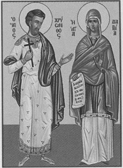 ι Άγιοι Χρύσανθος και Δαρεία έζησαν τον 3ο αιώνα μ. Χ. Ο άγιος Χρύσανθος ήταν γιος του ειδωλολάτρη άρχοντα Πολέμωνα. Κατηχήθηκε, όμως, στην πίστη του Χριστού και βαπτίσθηκε από κάποιον Επίσκοπο. Ο πατέρας του, που δεν άργησε να πληροφορηθεί το γεγονός, προσπάθησε με διάφορους τρόπους να τον μεταπείσει, αλλά χωρίς αποτέλεσμα. Τότε ο διάβολος τον οποίο λάτρευε, αφού δια των ειδώλων ενεργούν τα δαιμόνια, τον συμβούλευσε να κάνη για τον γιο του ό,τι έκανε και εκείνος για τον Αδάμ. Δηλαδή, τον παρέσυρε στην ανυπακοή και τον έβγαλε από τον Παράδεισο δια της Εύας.