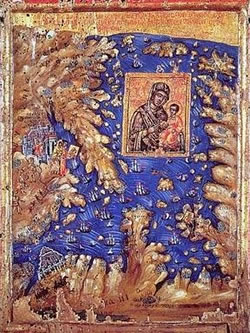 Κάθονταν οι άγιοι Γέροντες της Ιβήρων και μιλούσαν περί σωτηρίας ψυχής, όταν ξαφνικά είδαν μέσα στη θάλασσα ουρανομήκη λάμψη, και θαύμασαν που μπορούσαν κι έβλεπαν ακόμα και τη νύχτα να λάμπει κάτι σαν τον ήλιο. Μαζεύτηκαν όλοι οι Μοναχοί του Όρους και με βάρκες θέλησαν να πάνε στο περίεργο και θαυμαστό σημείο. Μπόρεσαν μόνο να διακρίνουν ότι ήταν μία εικόνα της Θεοτόκου, διότι όσο πλησίαζαν τόσο η εικόνα απομακρυνόταν. Οπότε, συγκεντρώθηκαν στην Εκκλησία και ικέτευσαν θερμώς τον Πανάγαθο να τους επιτρέψη να πάρουν την αγία Εικόνα. Πράγματι ο Θεός άκουσε τη δέηση τους και απήντησε με τον έξης τρόπο:
