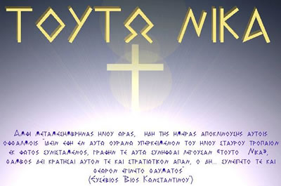 Ἀπό τήν πλευρά του ὁ Μέγας Κωνσταντίνος εἶχε κάθε λόγο νά αἰσθάνεται συγκρατημένος. Δέν εἶχε καμία ἄλλη ἐπιλογή ἐκτός ἀπό τήν ἐπίκληση τῆς δυνάμεως τοῦ Θεοῦ. Ἤθελε νά προσευχηθεῖ, νά ζητήσει βοήθεια, ἀλλά καθώς διηγεῖται ὁ ἱστορικός Εὐσέβιος, δέν ἤξερε σέ ποιόν Θεό νά ἀπευθυνθεῖ. Τότε ἔφερε νοερά στή σκέψη του ὅλους αὐτούς πού μαζί τους συνδιοικοῦσε τήν αὐτοκρατορία. Ὅλοι τους, ἐκτός ἀπό τόν πατέρα του, πίστευαν σέ πολλούς θεούς καί ὅλοι τους εἶχαν τραγικό τέλος. Ἄρχισε, λοιπόν, νά προσεύχεται στόν Θεό, ὑψώνοντας τό δεξί του χέρι καί ἱκετεύοντάς Τον νά τοῦ ἀποκαλυφθεῖ. Ἐνῶ προσευχόταν, διαγράφεται στόν οὐρανό μία πρωτόγνωρη θεοσημία. Περί τίς μεσημβρινές ὧρες τοῦ ἡλίου, κατά τό δειλινό δηλαδή, εἶδε στόν οὐρανό τό τρόπαιο τοῦ Σταυροῦ, πού ἔγραφε «τούτῳ νίκα». Καί ἐνῶ προσπαθοῦσε νά κατανοήσει τή σημασία αὐτοῦ τοῦ μυστηριακοῦ θεάματος, τόν κατέλαβε ἡ νύχτα. Τότε ἐμφανίζεται ὁ Κύριος στόν ὕπνο του μαζί μέ τό σύμβολο τοῦ Σταυροῦ καί τόν προέτρεψε νά κατασκευάσει ἀπομίμηση αὐτοῦ καί νά τό χρησιμοποιεῖ ὡς φυλακτήριο στούς πολέμους.