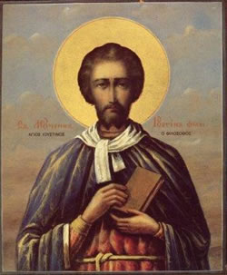 Τόν ἀληθῆ, τῆς εὐσεβείας κήρυκα, καί εὐκλεῆ, τῶν μυστηρίων ῥήτορα, Ἰουστῖνον τόν φιλόσοφον, μετ’ ἐγκωμίων εὐφημήσωμεν· δυνάμει γάρ σοφίας τε καί χάριτος, τόν λόγον κατετράνωσε τῆς πίστεως, αἰτούμενος πᾶσι θείαν ἄφεσιν.