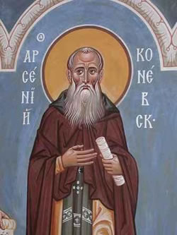 Ὅσιος Ἀρσένιος τῆς Κονεβίας καταγόταν ἀπό τό Νόβγκοροντ τῆς Ρωσίας καί ἠσχολεῖτο μέ τό ἐμπόριο τοῦ χαλκοῦ. Ἀπό ἀγάπη πρός τό μοναχικό βίο ἐγκατέλειψε τά ἐγκόσμια καί, μεταξύ τῶν ἐτῶν 1347 – 1358, εἰσῆλθε στή μονή Λίσικα κοντά στό Νόβγκοροντ, ὅπου ἔζησε ἕνδεκα χρόνια. Τό 1373, ἦλθε στό Ἅγιον Ὄρος ὅπου ἔζησε τρία χρόνια στήν προσευχή στό παλαιό Ρώσικο μοναστήρι. Στό μοναστήρι, μόλις ὁ ἡγούμενος ἐπληροφορήθηκε τί ἐπάγγελμα ἔκανε στό παρελθόν, τοῦ ζήτησε νά ἐπιδιορθώσει ὅλα τά παλαιά σκεύη πού ἐχρησιμοποιοῦσε ἡ ἀδελφότητα. Τοῦ ἐζήτησαν νά ἐργασθεῖ καί στά ἄλλα μοναστήρια. Ἡ ἐργασία ὄχι ἁπλῶς δέν ἀποτελοῦσε ἐμπόδιο γιά τήν προσευχή, ἀλλά τοῦ ἐκαλλιέργησε καί μία ὑψηλή αἴσθηση προσφορᾶς. Ἔτσι, ὁ Ὅσιος Ἀρσένιος ἐπήγαινε ἀπό τό ἕνα μοναστήρι στό ἄλλο καί ἐργαζόταν κατά τή διάρκεια τῆς ἡμέρας, ἐνῷ προσευχόταν κατά τό μεγαλύτερο μέρος τῆς νύχτας. Τελικά, τό 1393, ἐπέστρεψε στή Ρωσία μεταφέροντας μαζί του μία εἰκόνα τῆς Παναγίας, ἡ ὁποία ἀργότερα ὀνομάσθηκε «Παναγία τοῦ Κόνεβιτς».