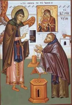 Ἑορτάζει σήμερον ἅπας ὁ Ἄθως, ὅτι ὕμνοις δέδεκται, ὑπό Ἀγγέλου θαυμαστῶς, σοῦ τῆς Ἁγνῆς Θεομήτορος, ἣν πᾶσα κτίσις γεραίρει δοξάζουσα.