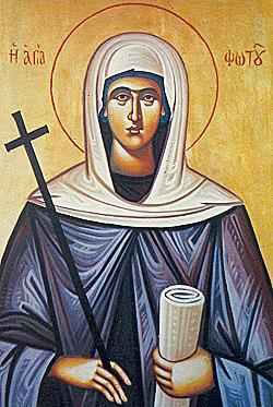 Ὁσία Φωτεινὴ πανένδοξε, τᾶς οὐρανίους μονάς, ἐπαξίως οἰκήσασα, σὺν παρθένων τάγμασι, καὶ ὁσίων στρατεύμασι, τοὺς ἐκτελοῦντας πίστει τὴν μνήμην σου, καὶ προσιόντας πιστῶς τὴ σκέπη σου, σῷζε πρεσβείαις σου, καὶ πταισμάτων ἄφεσιν παρὰ Θεοῦ, αἴτησαι καὶ λύτρωσιν, καὶ μέγα ἔλεος.