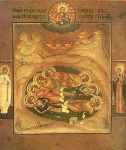 τά μέσα του 3ου αἰῶνα μ.Χ., ὅταν ὁ αὐτοκράτωρ Δέκιος ἄναψε τό καμίνι τῶν διωγμῶν καί χωρίς καμιά διάκριση βασάνιζε καί σκότωνε νέους καί γέρους, τότε καί οἱ ἑπτά παῖδες, Μαξιμιλιανός, Ἐξακουστοδιανός, Ἰάμβλιχος, Μαρτινιανός, Διονύσιος, Ἀντωνῖνος καί Κωνσταντῖνος, γιά νά μήν ἀρνηθοῦν τήν πίστη τους, ἀφοῦ διαμοίρασαν τά ὑπάρχοντά τους στούς φτωχούς, ἔφυγαν ἀπό τήν πόλη καί κρύφτηκαν σέ κάποια σπηλιά, μέχρι νά πάψει ὁ διωγμός.